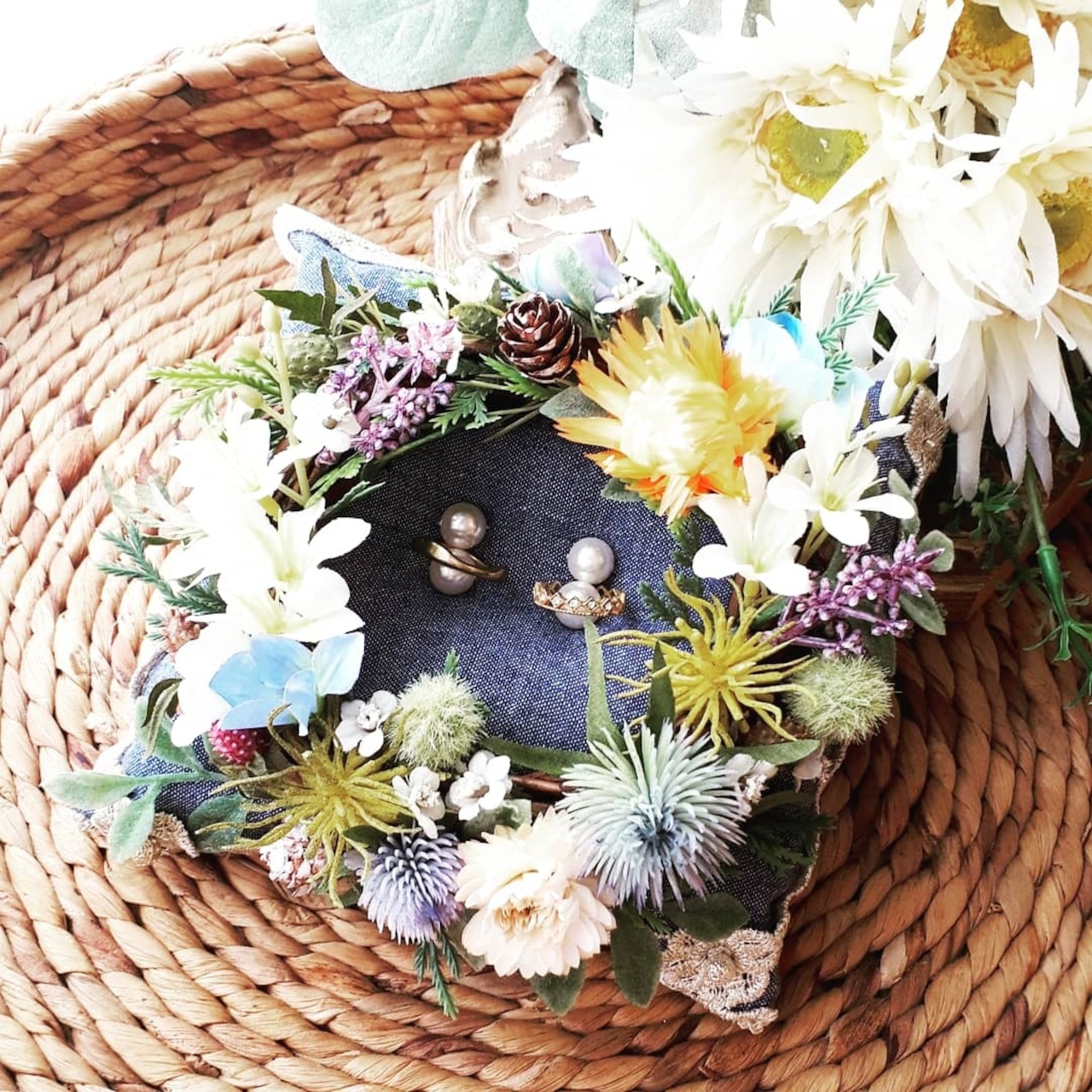 爽やかなブルーデニムの台座周りにホワイトゴールドの優しいレースをあしらいました。