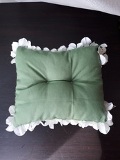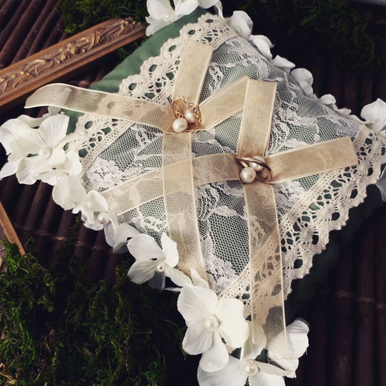 優しい白色の小さな花のステージに囲まれたお二人をイメージしたオータムリングピロー
