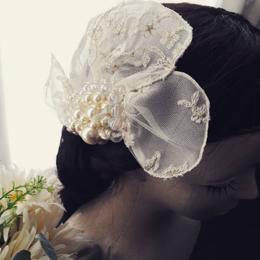 小ぶりの花びらを4枚丁寧に重ね、たっぷりのパールと透明キラキラビーズで流れる曲線を美しく表現しました。